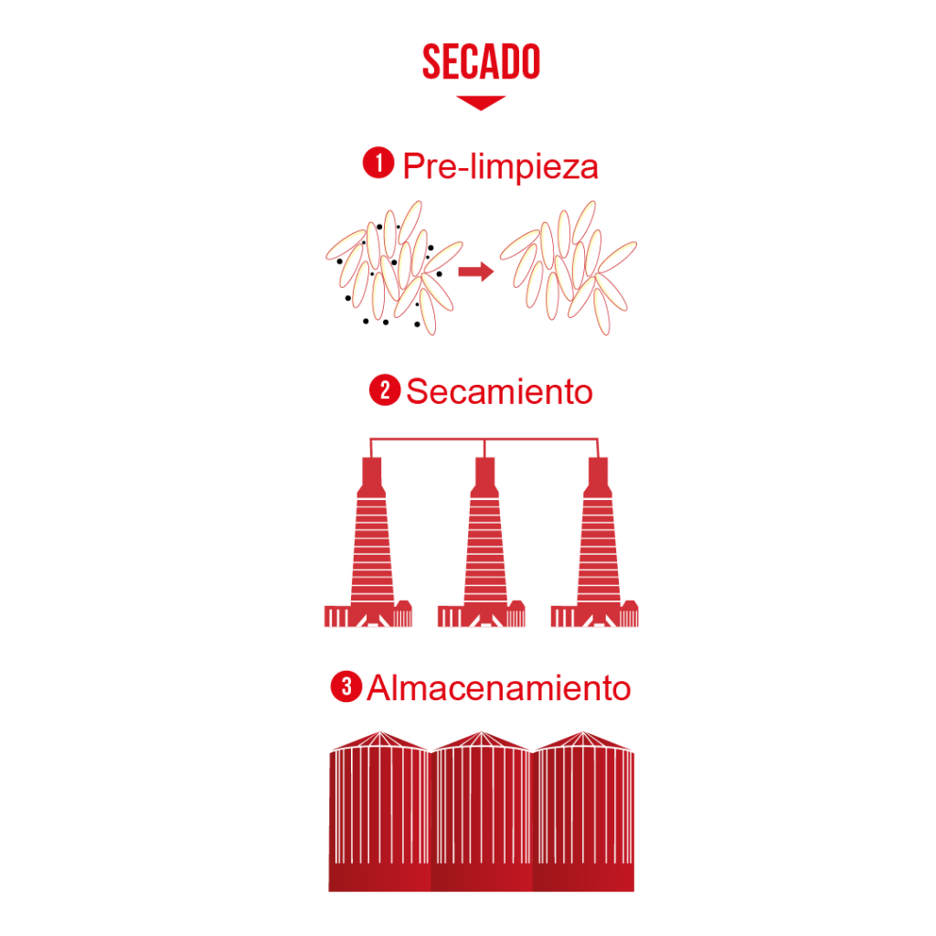 El arroz cuando es cosechado en el arrozal, no es un producto acto para almacenar y guardar ya que viene del arrozal con cierto grado de humedad, que fluctúa según las condiciones ambientales, la cual puede variar de l8 grados hasta 30 grados de humedad. El arroz es transportado hacia nuestros molinos, el arroz es expuesto a estos elementos antes mencionados, y por medio de este procedimiento se le bajara la humedad al grano, hasta que obtenga una humedad optima para su almacenamiento.
